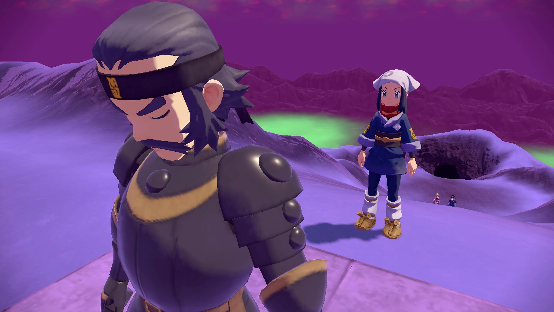 Mittlerweile wurde die Gipfelbasis errichtet, die sich in der Nähe von Lektrobals Hoheitsstätte befindet. Vor unserem Aufbruch werden wir noch von Volo aufgehalten, der uns drei Top-Tränke als Stärkung für die Pokémon übergibt. Anschließend können wir auch schon den kurzen Anstieg wagen, bis wir bei einem Höhleneingang ankommen. Dieser war zuvor versperrt und führt direkt zum Sinnoh-Tempel.
