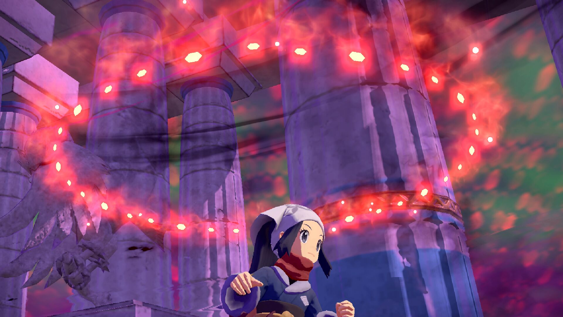 Sobald wir das Ehrwürdige Sinnoh gefangen haben, scheint sich am Riss und der aktuellen Situation nichts zu ändern. Unsere Begleitung erfährt durch das Legendäre Pokémon die Information, dass sein Gegenstück im Inbegriff ist, in diese Welt zu treten. Durch einen weiteren Riss gelangt schließlich ebenjenes Pokémon auch in den Sinnoh-Tempel und wir erkennen, dass es wohl zwei Ehrwürdige Sinnoh gibt. Ohne die Macht der Roten Kette sind wir allerdings nicht imstande, etwas gegen die Übermacht zu unternehmen und Denboku schlägt den Rückzug vor.