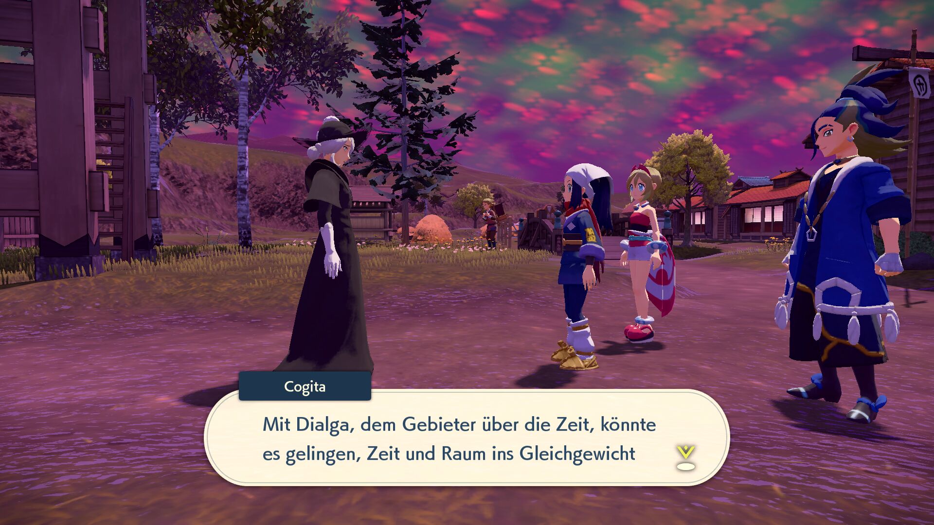 Bevor wir erneut aufbrechen können, gelangt Cogita ins Dorf und erinnert uns daran, dass Zeit und Raum nicht getrennt werden dürfen. Darum müssen wir das zuvor gefangene Pokémon mitnehmen und mit ihm versuchen, die Verheerung aufzuhalten.