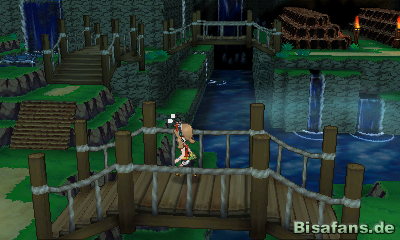 Setzt am Anfang der Höhle Surfer ein, um den kleinen Extraeingang betreten zu können und ins Innere der Siegesstraße zu gelangen. Um weiter in den Berg hinein zu gelangen müsst ihr Stärke einsetzen und den großen Stein aus dem Weg schieben. Geht anschließend nach oben und erklimmt die erste Treppe, um über eine Brücke gehen zu können und dort das Item Hyperheiler zu erhalten.