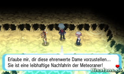 Um in den Meteorfällen einen Meteoriten zu finden müsst ihr diese bis an die Spitze durchsuchen. Schwimmt dafür den Wasserfall hoch und folgt dem Weg. Haltet euch im nächsten Raum rechts und klettert dort eine Leiter hoch, die euch in einen weiteren Raum bringt. Vorbei an einem Drachenprofi gelangt ihr in eine weitere Etage. Seid ihr an der Spitze des Berges angelangt trefft ihr auf Troy, der mit einer älteren Dame redet. Die Frau erzählt euch schließlich was es mit der Mega-Entwicklung auf sich hat und er Amalia ist. Troy macht sich schließlich auf den Weg zurück nach Metarost City. Verlasst anschließend die Höhle wieder und folgt ihm zu dem Devon Anwesen in Metarost. Vergesst auf dem Rückweg nicht euch links zu halten und den Aerodactylnit aufzusammeln.