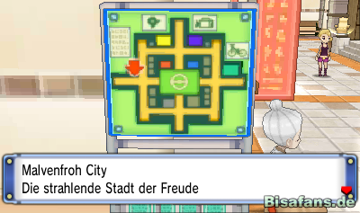 In Malvenfroh angekommen trefft ihr Heiko wieder, der fasziniert über Malvenfroh Citys Größe ist. Er scheint jedoch nur daran interessiert zu sein die Arena der Stadt zu schaffen. Da dies auch unser Ziel ist könnt ihr ihm einfach in die Mitte der Stadt folgen. Schräg links oben befindet sich ein Pokémon-Center in dem ihr euer Team wieder auf Vordermann bringen könnt. Verlasst das Center wieder und geht durch den mittleren Gang noch weiter nach oben. Ihr trefft dort wieder auf Heiko und seinen Onkel, die sich nicht einigen können, ob Heiko in der Arena kämpfen soll oder nicht. Schließlich bemerken sie euch und ihr werdet gefragt, ob ihr einen Kampf mit Heiko kämpfen wollt. Diese Bitte können wir ihm natürlich nicht ausschlagen.