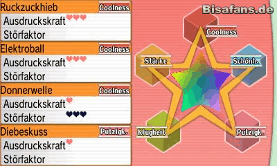 Hat ein Pokémon besonders hohe Werte auf einem oder mehreren dieser Attribute, wird es im Wettbewerb in der ersten Runde besser von der Jury bewertet und ihr habt es leichter eine hohe Punktzahl zu erlangen. Bevor ihr also mit einem Pokémon bei einem Wettbewerb antretet, empfiehlt es sich dieses Pokémon mit Pokériegeln zu füttern.