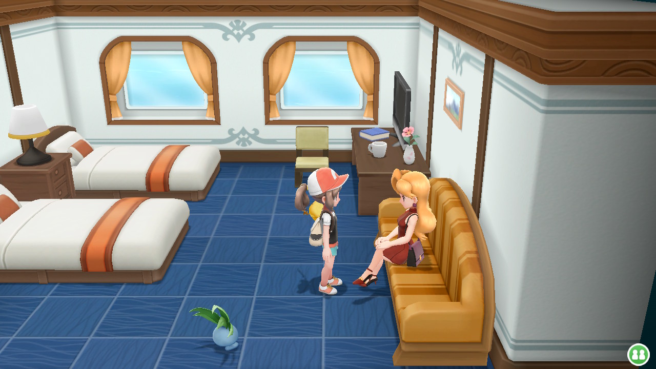 Nach dem Gespräch könnt ihr das Schiff frei erkunden und gegen einige Trainer kämpfen. Geht nach links und dann die Treppe nach oben, um ein Stockwerk höher zu gelangen. Weiter nach links gelangt ihr an Deck des Schiffes, wo ihr an der Spitze mit eurem Partner aufs Meer schauen könnt und eure Freundschaft stärkt. Zurück im Inneren der MS. Anne müsst ihr dem Weg folgen, um dann gegen euren Rivalen zu kämpfen. Er besitzt nun wesentlich stärkere Pokémon als noch in Azuria City, achtet darauf, gerüstet zu sein! Habt ihr den Kampf gewonnen, könnt ihr ins Kapitän-Zimmer gelangen, allerdings geht es ihm nicht allzu gut. Zeigt ihm Tricks gegen Übelkeit und er lehrt eurem Partner die geheime Technik Spaltschnitt! Mit dieser könnt ihr nun zur Arena, da ihr den Busch davor zerschneiden könnt. Verlasst die MS. Anne und seht eine schöne Cutscene, bei der das Schiff ablegt.