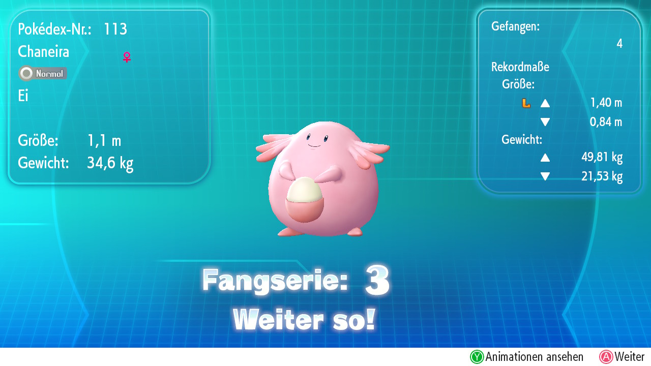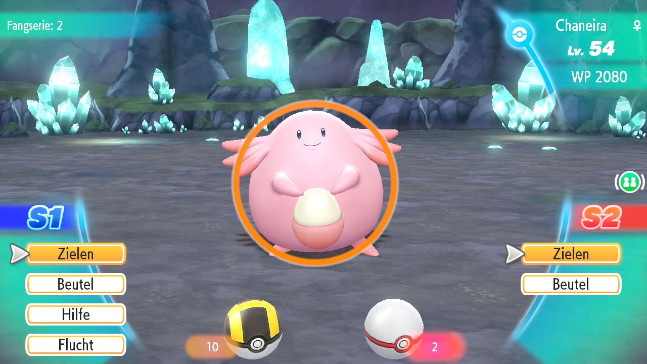 Eine Fangserie stellt ihr immer dann auf, wenn ihr gleiche Pokémon mehrmals hintereinander fangt. Wie hoch eure Fangserie ist, wird euch nach jedem Fang eines Pokémon oder im Fangbildschirm oben links stets angezeigt. Fangt ihr während des Levelns die ganze Zeit nur Chaneira, erhöht sich eure Fangserie und ihr erhaltet automatisch schrittweise mehr Erfahrung als normal. Fangt ihr zusätzlich besonders kleine oder große Pokémon, erhaltet ihr ebenfalls einen großen Erfahrungsbonus. - Zweiter Spieler