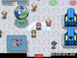 Dann gibt es noch andere kleine Mini-Minispiele. Bei dem einen kann man die Fußabdrücke der Pokémon, die man in seinem Team hat, auf ein Papier stempeln. Die Füße hüpfen dann immer in lustigen Posen davon. Außerdem gibt es noch einen Globus, der offenbar eine ähnliche Funktion hat wie der alte Globus aus Diamant und Perl in der GTS. Dann gibt es noch ein Umfragecenter. Das funktioniert ähnlich wie der Meinungskanal.