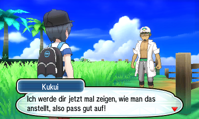 Betritt man die Demo erneut, findet man sich vor dem Pokémon-Center zusammen mit Professor Kukui wieder. Er schenkt einem das PokéMobil-Funk, mit Hilfe dessen man sich nun auch mit Pokémon fortbewegen kann.