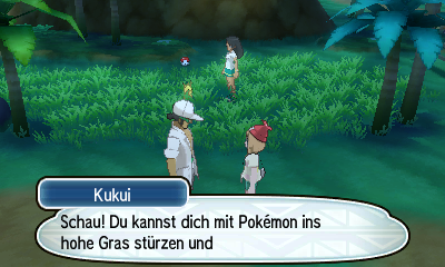 Zusammen geht ihr auf Route 1, welche steil bergauf geht. Folgt dem Pfad hinauf auf den Berg und trefft dort Kukui wieder, der euch weiter über Route 1 begleitet. Er stellt euch im Zuge dessen gleich vor, dass man im hohen Gras sowohl Pokémon fangen kann, als auch gegen andere Trainer kämpfen kann. Ein paar Schritte weiter und ihr befindet euch bereits in Lili’i.