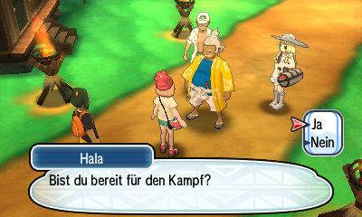 Zurück in Lili’i offenbart euch Kukui, dass das blonde Mädchen seine Assistentin Lilly ist. Ihr stellt euch kurz gegenseitig vor, bevor der Inselkönig Hala erscheint. Er hört von der Geschichte auf der Hängebrücke und möchte sich bei euch mit einem Pokémon bedanken. Im Gegenzug aber bittet er euch den weg eines Pokémon-Trainers einzuschlagen. Er stellt euch schließlich vor die Wahl welches der drei Starter-Pokémon ihr auswählen wollt: