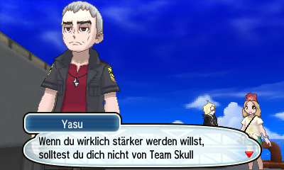 Yasu ist der stärkste Gegner, dem ihr bis jetzt begegnet seid. Mit seinen Pokémon, die alle Juwelenkraft und Finsteraura beherschen ist es ein leichtes für ihn viel Schaden in kurzer Zeit anzurichten. Besonders gefährlich kann euch Rokkaiman werden, der mit seiner Attacke Angeberei eure Pokémon verwirren und somit am Angreifen hindern kann. Auch Snobilikat, welches er häufig zuletzt einsetzt, ist eine große Hürde. Es besitzt viel Initiative, sodass es oftmals als erstes angreifen kann, wenn eure Pokémon nicht schneller sind und trägt zudem noch ein Noctium Z mit dessen Hilfe Yasu die Z-Attacke von Snobilikat einsetzen kann. Achtet bei diesem Kampf besonders darauf, dass seine Poémon eure nicht mit einem Schlag besiegen und geht eventuell vorher noch einmal trainieren, um gut gewappnet zu sein.