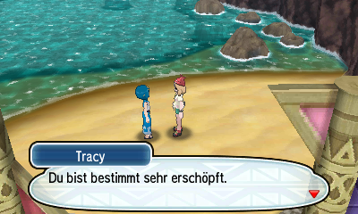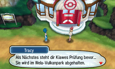 Tracy erzählt euch vor dem Pokémon-Center von der dritten Prüfung, an der ihr teilnehmen sollt. Sie befindet sich im Wela-Vulkanpark. Mit Hilfe des Aqium Z könnt ihr nun den versperrten Mogelbaumweg bei der Ohana-Farm durchqueren.