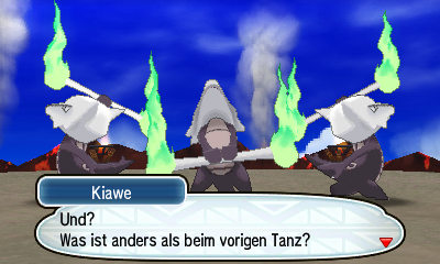 Nehmt ihr sein Angebot an, beginnt die Prüfung. Eure Aufgabe ist es dieses Mal genau zu beobachten, denn ihr müsst euch entscheiden worin sich euch zwei vorgezeigte Tänze unterscheiden. Drei Knogga tanzen euch dann anschließend eine Choreografie vor, die sich beim zweiten Mal vom ersten Mal unterscheidet. Merkt euch gut, was die drei Pokémon tun, um die Frage von Kiawe nach dem Unterschied am Ende passend beantworten zu können.