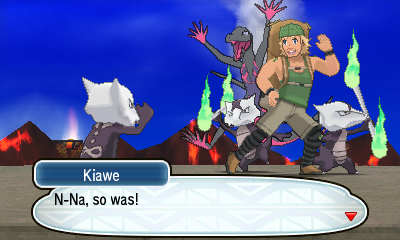Besiegt die drei Gegner und redet im Anschluss mit allen in der Eingangshalle. Nach einem kurzen Gespräch stößt Kiawe zu euch, der der Captain der dritten Prüfung ist. Er lädt euch ein auf den höchsten Punkt des Wela-Vulkanparks zu kommen, um sich seiner Prüfung zu stellen.