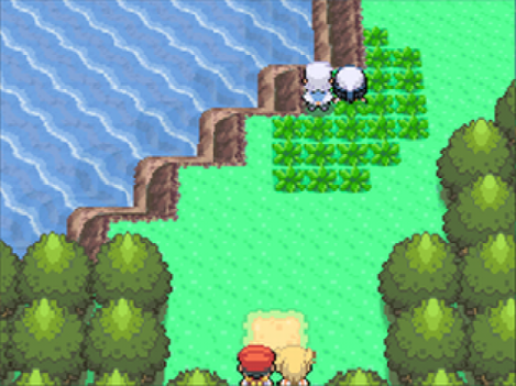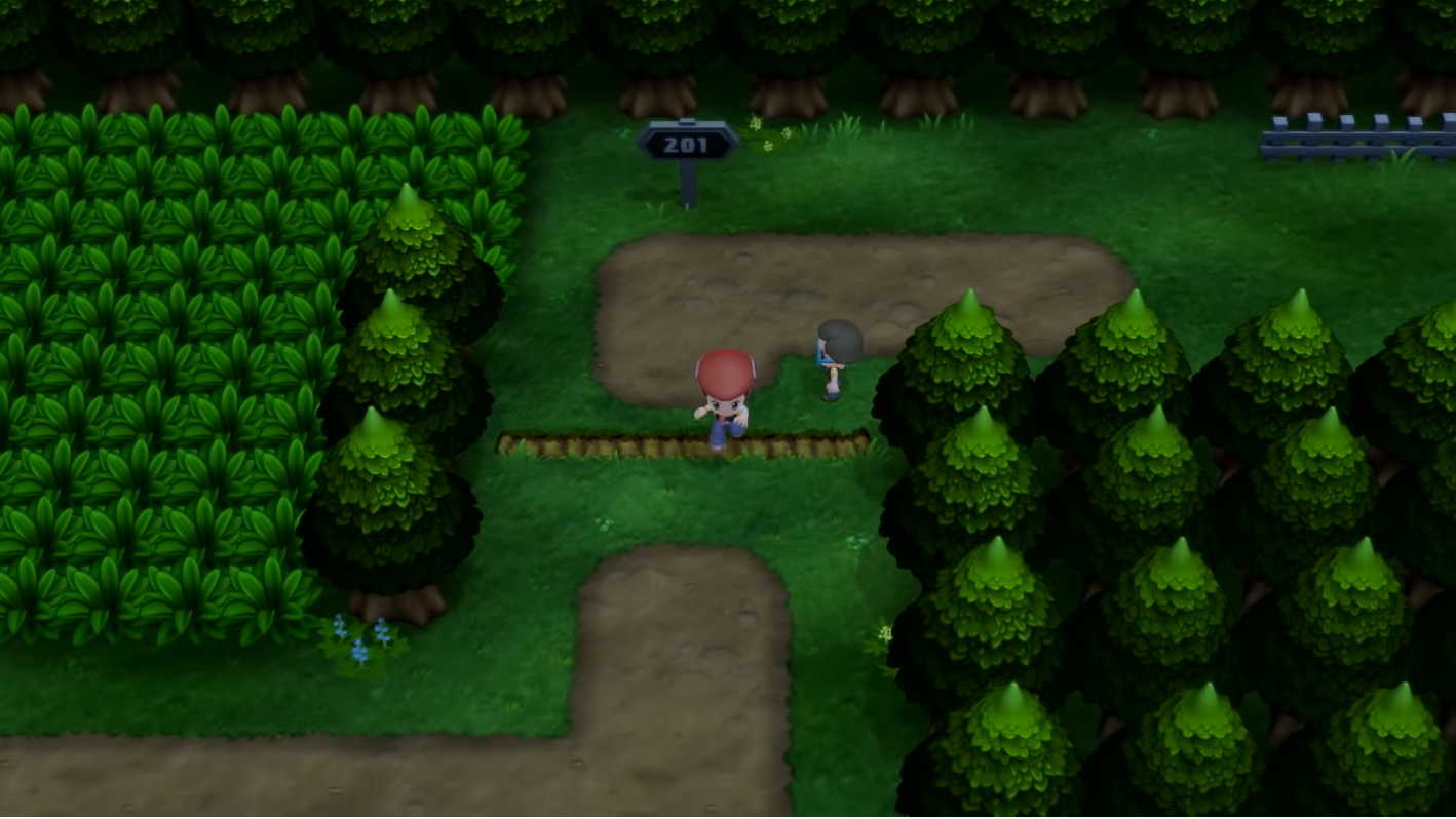 Recht früh trifft man in Zweiblattdorf auf seinen Rivalen Barry; dieser ist wie immer sehr sehr stürmisch unterwegs und rennt euch auch im Remake fast über den Haufen. Er wohnt nach wie vor in dem Haus links oben im kleinen Zweiblattdorf, das sein Aussehen kaum verändert hat. Das Gras neben den Häusern scheint jedoch etwas weniger einfarbig zu sein, da es kleine Grasbüschelchen und Blümchen erhalten hat.