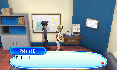 Um die Mission rund um die Dittos zu starten, müsst ihr zunächst auf Route 9 in die Polizei-Station gehen und dort den Polizisten vorne ansprechen. Er erzählt schießlich davon, wie sich sein Kollege in letzter zeit etwas komisch verhalten hat und auch, dass sich Dittos gerne einmal in Menschen verwandeln, um andere zu täuschen. Sprecht daraufhin den zweiten Polizisten weiter hinten an, um auf das erste Ditto zu treffen.