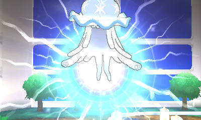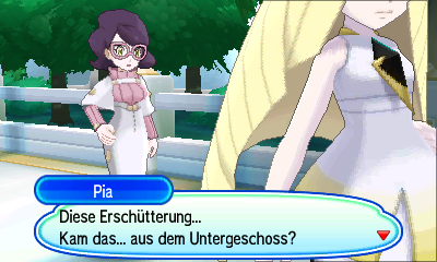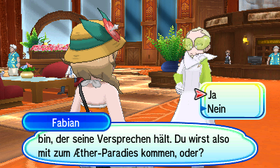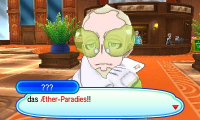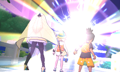 Mitten im Gespräch werdet ihr jedoch plötzlich unterbrochen. In der Schutzzone öffnet sich eine Ultrapforte und ein merkwürdiges Pokémon erscheint. Geht auf es zu und ein Kampf beginnt.