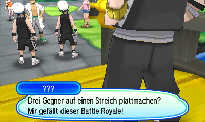 steht ein Mann, der euch sagt, wie viele Kämpfe ihr bereits bestritten habt und euch herausfordert. Wenn ihr ihn besiegt, schenkt er euch ein