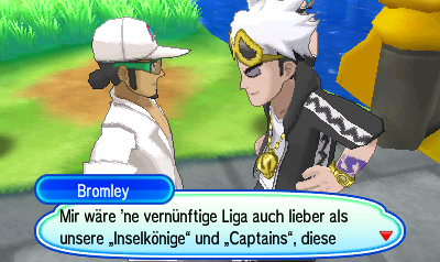 Im Ziergarten stoßt ihr auf Professor Kukui, der zwei Team Skull Rüpeln sagt, dass er maximal vier Runden braucht, um sie zu besiegen. Daraufhin taucht Bromley auf und pöbelt Kukui an. Kukui sagt ihm, dass ihr unglaublich stark seid, woraufhin euch Bromley herausfordert.