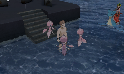 Schwingt euch nun auf Lapras in das Wasser und schwimmt zur Plattform, die ihr auf dem Rotom-Dex eingezeichnet seht. Dort wird eine Frau von drei weiblichen Quabbel