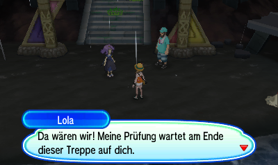Geht nun zu Lola, damit die Prüfung beginnt. Falls nötig könnt ihr davor auch nochmal zum Pokémon-Center fliegen, um eure Pokémon heilen zu lassen.
