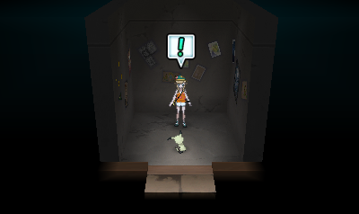 Der Pokémon-Sucher aktiviert sich von selbst. In dem kleinen Hinterzimmer findet ihr eine verstörende Anzahl von Pikachu-Bildern und anderem Pikachu-Merchandise. Dreht euch um und ihr stoßt auf das Herrscher-Pokémon Mimigma, welches euch angreift.
