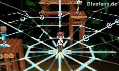 In der Arena selbst findest du dich auf einem Spinnennetz wieder, auf dem du laufen kannst. Jedoch nur dort, wo die Fäden besonders breit sind. Schlage dich also durch die verschiedenen Trainerkämpfe (die Pokémon der Pokémontrainer sind ungefähr auf Level 7-10) und arbeite dich erfolgreich bis zur Käfer-Arenaleiterin vor.