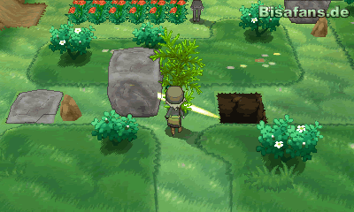 Folge zunächst dem Pfad und stoppe an dem Feld mit roten Blumen. Du kannst von dort aus mit Surfer über das nahegelegene Wasser gleiten und dem Flusslauf bis zu einem Item folgen. Am Ende des Baches findest du eine Käfertafel. Geh danach wieder zurück und weiter nach oben. Du findest schließlich einen einsam stehenden Stein hinter einem kleinen Rosenfeld. Klicke ihn an, um einen Megablock zu erhalten. Gehst du danach nach rechts, findest du einen verschiebbaren Stein. Schiebe ihn dreimal nach rechts, einmal nach links und dann nach oben, um dir deinen Weg über das Loch zu bahnen. Du kommst schließlich an das Haus des Attacken-Helfers, der deinen Pokémon früher erlernte Attacken beibringen kann! Nutze die Chance und verstärke dein Team durch tolle Attacken, bevor du die Siegesstraße betrittst.