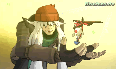 - Pokémon-Trainer Kalem mit Psiaugon (57), Absol (59), Aquana (57), Altaria (58), Brigaron (61)