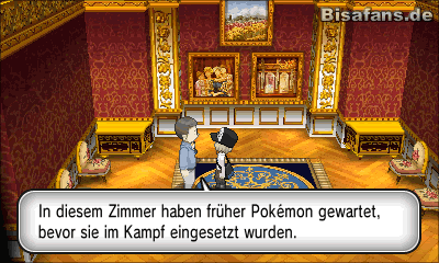 Bist du im Palast angekommen, solltest du zunächst links oben das Item äther holen. Von der Frau in Grün erhältst du außerdem eine Sinelbeere. Im ersten Stockwerk links findest du das sehr praktische Münzamulett, was das Preisgeld gegen alle Trainer verdoppelt! Gehe danach zum Eingang des Palastes und betrete ihn.