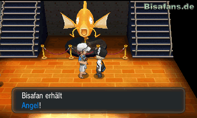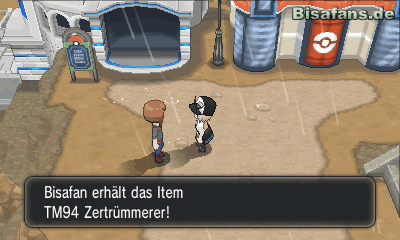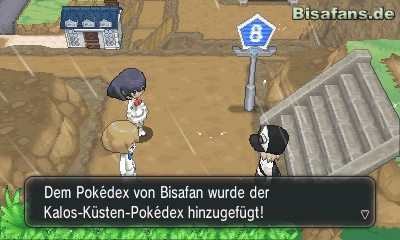 Kurz bevor du zum Pokémon-Center gehen kannst, um dein Team zu heilen, wirst du von Kalem angesprochen. Dieser erzählt dir, dass er sich auf den Weg in das Fossilienlabor macht, um Informationen über Mega-Steine zu erhalten. Diese Information solltest du im Hinterkopf behalten. Nachdem du deine Pokémon geheilt hast, kannst du die Person vor dem Pokémon-Center ansprechen. Sie gibt dir eine besondere TM94 Zertrümmerer. Mit dieser TM kannst du später Steine zertrümmern und dir neue Wege dadurch bahnen. Geh nun in das Aquarium der Stadt und sprich den Angler im unteren Teil der Ausstellung an. Dieser gibt dir, wenn du Interesse zeigst, eine Angel mit der du Pokémon aus Wasserstellen fischen und schließlich fangen kannst. Ein paar Schritte weiter unten in der Stadt trefft ihr auf eine Person, die einen Pokéball gegen einen Tauchball tauscht. Nutzt diese Chance und geht den Tausch ein, um einen günstigen Tauchball zu erhalten.