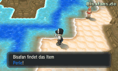 Kaum einen Fuß auf den Sand gesetzt, solltest du dich nach links begeben. Dort ist es dir möglich außen am Aquarium entlang zu laufen. Schließlich kommst du zu einer Sackgasse mit dem Item Perle. Gehst du wieder zurück solltest du die drei Steine auf dem Weg zertrümmern. Zerstörst du sie erhältst du die Items Granitstein, Riesenperle und Pudersand. Bist du wieder auf dem Hauptweg halte dich etwas links, um einen Magobeerbaum zu finden. Vor ihm liegt eine Magobeere, die du mitnehmen kannst. Gehst du nun weiter nach oben erhältst du von einer Schwimmerin einen Itemradar. Mit Hilfe dieses Basis-Items kannst du von nun an auch versteckte Items ausfindig machen und sie nicht mehr übersehen. Versuch immer möglichst oft das Radar einzusetzen. Setz den Radar gleich einmal ein; ein paar Schritte nach unten und nach links findest du sofort eine Perle für die man viel Geld erhält wenn man sie verkauft. Außerdem befindet sich hinter einem Stein in der Mitte das Item Hyperball. Links von dem Magobeerbaum findest du außerdem Sternenstaub. Gehe an der Küste entlang, um dort eine Herzschuppe zu finden. Nutze den Radar so oft du kannst! Folge schließlich dem Weg unter dem Felsen hindurch und besiege die Trainer die dort auf dich warten.