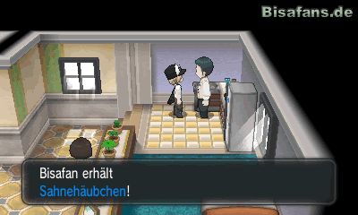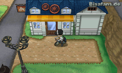 Verlasse dann das Pokémon-Center und begib dich wieder in Richtung Eingang der Stadt nach unten. Dort steht ein Mann in Karate-Anzug; laufe schräg an ihm vorbei zum Stein hinter dem Haus rechts von ihm. Dort findest du das Item äther. Gehst du danach in das Haus unter dir und sprichst den Mann in der Küche an, erhältst du das Item Sahnehäuptchen. Gehe nun wieder in Richtung des Pokémon-Centers und betritt den Laden direkt rechts daneben. Dort erhältst du ein Fahrrad mit dem du dich schneller fortbewegen kannst. Du musst dafür jedoch eine Frage richtig beantworten. Hast du dies geschafft (Die Antwort lautet „Ja natürlich“) erhältst du deinen Preis.