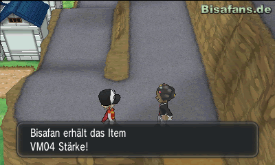 Gehst du – wieder draußen - rechts den Fahrradweg nach oben kommt dir eine Person entgegen und schenkt dir die VM04 Stärke. Mit Hilfe dieser Attacke kannst du große Steine aus dem Weg schieben und dir so neue Wege zu Items oder ähnlichem schaffen. Folgst du dem Weg nun nach unten siehst du links ein Item auf dem Berg liegen. Hol es dir indem du den Hang hinab rutschst. Sobald du das getan hast kannst du X-Abwehr dein Eigen nennen. Geh den selben weg wieder zurück und klicke vor dem Höhleneingang auf den untersten Stein. Dort findest du das Item Protein. Folge dem Weg bis ganz nach oben auf den Berg und fahre den Abgang einmal hinunter. Gehst du dann nach unten kannst du an das Item X-Spezial gelangen. Fahre nun den nächsten Abhang hinunter und schau hinter den Bänken weiter unten nach einem Item. Dort befindet sich ein Supertrank. Von dort aus musst du nun wieder zurück zum großen Höhleneingang. Betrittst du nun die Höhle findest du dich in der Arena der Stadt wieder.