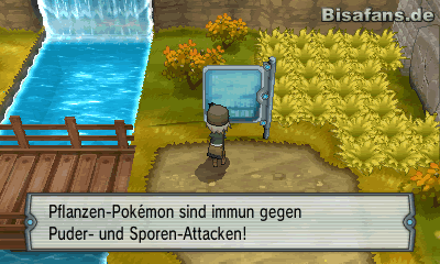 Folgt zunächst dem Weg nach unten. Dort findet ihr in einer kleinen Sackgasse einen Blätterhaufen. Zerstört ihn, indem ihr über ihn rennt und den Pokéball nehmt, der einen Beleber in sich trägt. Geht wieder zurück und folgt dem Weg. Macht unterwegs alle Blätterhaufen kaputt, um einen Netzball und Angriffplus zu erhalten. Folgt ihr dem Weg weiter nach rechts, findet ihr einen Jonagobeerenbaum. Schnappt euch die Beeren dort und legt sie in die Itemtasche. Geht danach links neben den Baum. An der Wand findet ihr das Item Gegengift. Kurz bevor ihr vor der Brücke stest, solltet ihr noch mit Surfer dem Flusslauf nach oben folgen. Zertrampelt auch hier die Blätterhaufen, um unter dem zweiten einen Minipilz zu finden. überquert ihr schließlich die kleine Brücke, seht ihr oben rechts ein Schachbrettmuster auf dem Boden. Ein Stein aus der Wand sieht sehr brüchig aus; wenn ihr ihn mit Zertrümmerer zerschlagt, erhaltet ihr das Item Protein. Des Weiteren könnt ihr, wenn ihr danach nach unten geht, einen langen schmalen Weg folgen, über zwei Steine hüpfen und dann zu einem Pokéball gelangen, der einen Hyperheiler birgt.