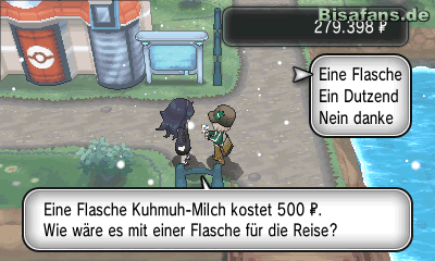 Nachdem du dein Team im Pokémon-Center hast heilen lassen, kannst du abermals Mr. Miteinander ansprechen. Dieser schenkt dir eine weitere praktische O-Kraft, Genauigkeit-Kraft Lv1. Außerdem schenkt dir die orangehaarige im Gebäude eine Tsitrubeere, wenn du sie ansprichst. Anschließend kannst du das Center verlassen und links unten am Weg einen Heilball finden. Außerdem hast du die Möglichkeit Kuh-Muh-Milch von einer Hexe vor dem Pokémon-Center zu erwerben.