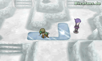 Rutsche zunächst einmal gerade über die Eisfläche. Du hältst am anderen Ende der Höhle und kannst rechts einen Stein anklicken, der einen Eisheiler verbirgt. Rutsche nun nach unten, rechts, unten, links, oben, um wieder auf festem Boden zu landen. Rutsche danach von der unteren Eiszunge aus nach links, um weiter zu kommen. Hast du gegen Wanderer Gustel gekämpft, kannst du nach oben gehen, um einen Pokéball mit einem weiteren Eisheiler zu finden. Gehe dann nach links weiter und folge dem Weg, bis du wieder nach unten laufen kannst. Schalte dein Itemradar ein und finde das Item Perle an einem kleinen Felsen. Surfe nun über das Wasser und gehe die Treppe hinunter. Dort findest du einen mit Eis überzogenen Stein. Außerdem gibt es unten rechts das Item Eisbrocken. Schwimme dann wieder rüber auf die rechte Seite des vorherigen Raumes. Gehst du nun durch den Eingang, kannst du von dem blonden Mädchen deine Pokémon heilen lassen. Des Weiteren findest du weiter unten das Item Hypertrank.