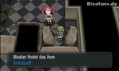 Kaum kommst du in die Ruine, kannst du beim zweiten Stein Zertrümmerer einsetzen, um an eine Furchttafel zu gelangen. Folgst du dem Weg bis ganz nach links, erhältst du dort die TM56 Schleuder von einer Rollerskaterin. Gehe dann nach oben und schließlich nach links, um hinter einer weiteren zerstörbaren Wand das Item Schützer zu finden.