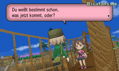 Gehe nun durch das Blumenfeld nach rechts und schließlich nach unten, um im zweiten Blumenfeld mit dem Itemradar ein Gegengift zu finden. Gehe nun weiter bis du an eine Passage kommst, bei der du über ein paar Steine hüpfen kannst. Springst du bis zur Mitte wirst du dort mit einem Top-Beleber belohnt. Gehst du danach nach unten und durch den kleinen Weg (hinter dem Blumenfeld) findest du am Ende des Pfades ein KP-Plus. Anschließend kannst du dich auf den Weg über die große Brücke machen. Doch mitten auf dieser Brücke hält sich Sannah auf, die gegen dich kämpfen möchte. Nachdem du Professor Platan besiegt hast, sollte sie ein leichter Gegner sein! Doch dem ist nicht genug – kaum hast du den Kampf erfolgreich bestanden, erscheinen auch Tierno und Trovato, die die ebenfalls zum Kampf herausfordern. Als Belohnung für die vielen Kämpfe erhältst du schließlich die VM05 Kaskade mit der du Wasserfälle hinauf fahren kannst! Gehe nun weiter in die nächste Stadt!