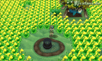 Gehe danach weiter nach unten rechts. Du kannst dort über die Schienen laufen und schließlich nach rechts abbiegen. Hast du dies getan, findest du auf dem Gras das Item Top-äther. Danach musst du wieder zurückgehen und die Treppe nach unten steigen. Folge dann dem Weg nach unten und laufe durch das rote Blumenfeld. Rechts unter dem großen Felsen findest du eine leere Stelle in den Blumen – dort versteckt sich das Item Honig, das du mit A aufheben kannst.