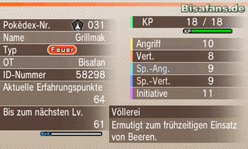 Das linke Grillmak ist in absolut allen Statuswerten unterlegen. Es lohnt sich also definitiv zwei oder drei Pokémon zu fangen, wenn man weiß, dass man eines in das Team aufnehmen will und dann das beste zu wählen. Bei der Zucht in der Pension sollte man entsprechend zwei oder drei Eier ausbrüten. Der Aufwand wird durch Statuswerte belohnt, die sich rund 20% unterscheiden können, was in Kämpfen mit steigendem Level immer deutlicher spürbar wird. Die Unterschiede in den Statuswerten werden nämlich proportional fortgesetzt. Wenn ein Pokémon auf Level 5 also weniger Statuspunkte hat, wird das auf Level 100 immer noch so sein. Natürlich ist es vorteilhaft Pokémon für diesen Vergleich auf einem gleichen Level zu haben. Den EP-Teiler sollte man daher zeitweise ausschalten, damit Pokémon nicht versehentlich leveln und den Vergleich erschweren.