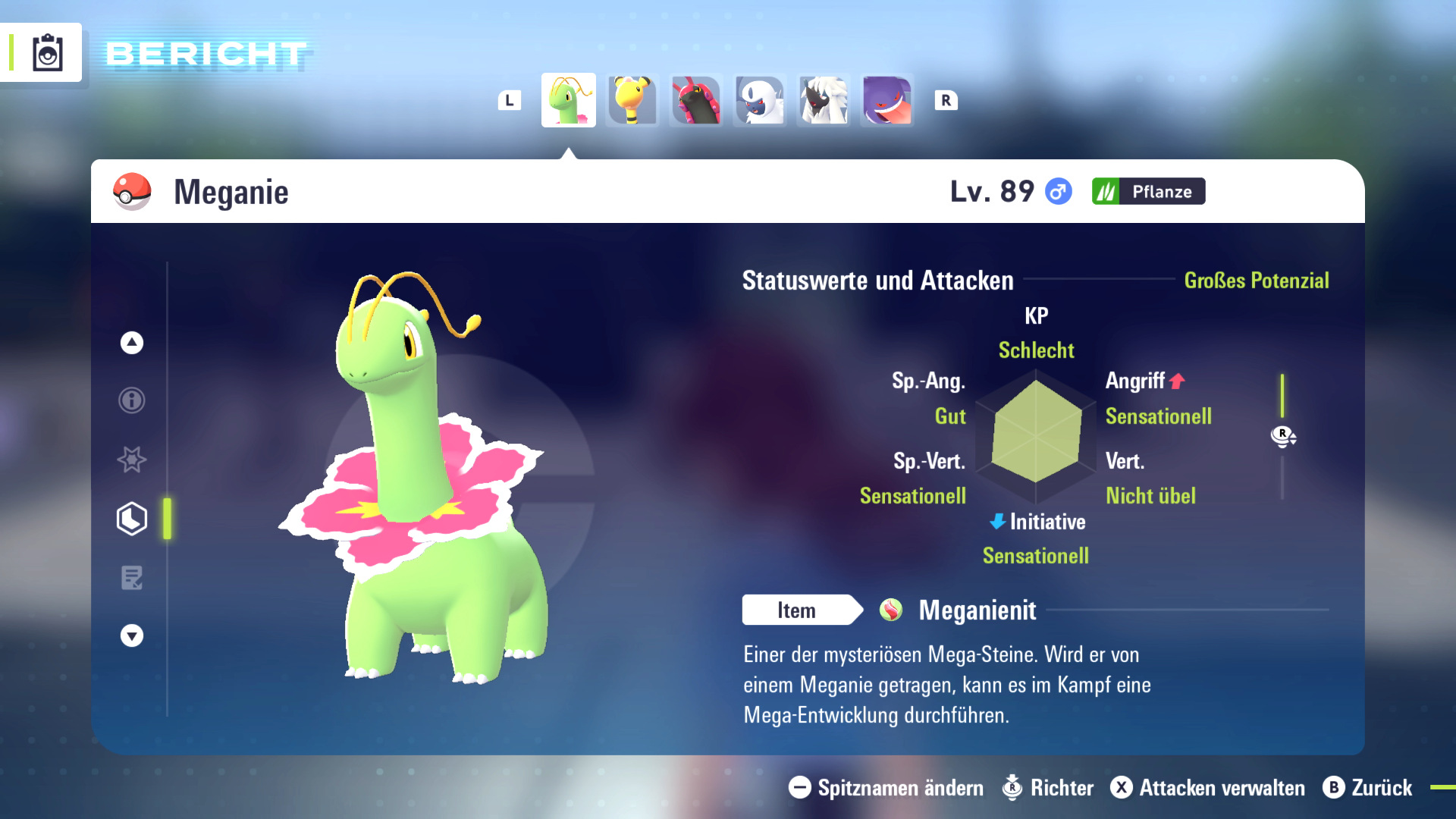 Habt ihr erfolgreich die Hauptgeschichte abgeschlossen, wird die Richter-Funktion freigeschaltet. Diese kann in der Boxen-Ansicht genutzt werden indem der rechte Stick gedrückt wird. Damit öffnet sich auf der rechten Seite der Box-Ansicht eine Analyse des aktuell betrachteten Pokémon. In dieser Ansicht können mehrere Pokémon durchgeschaut werden.