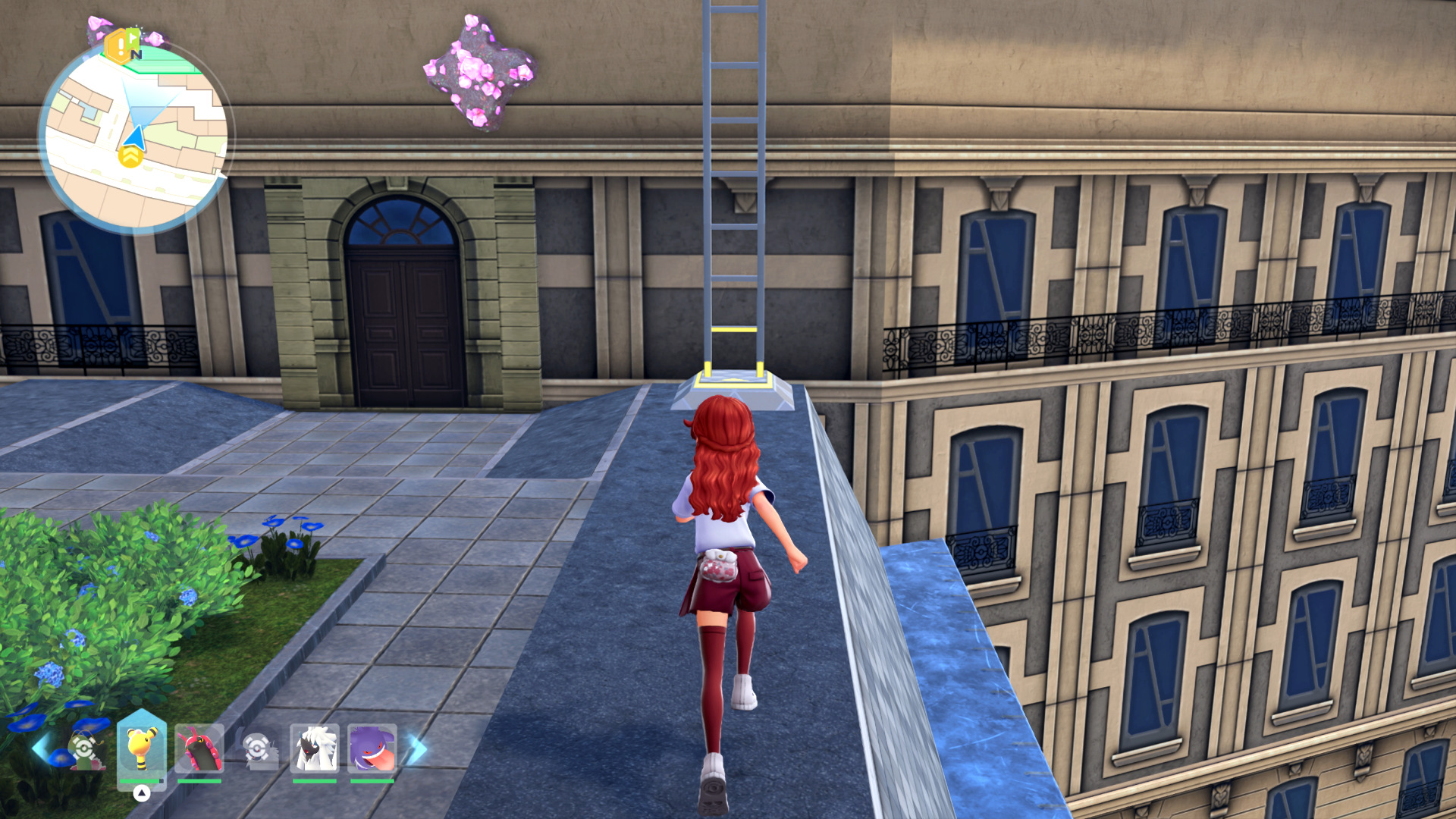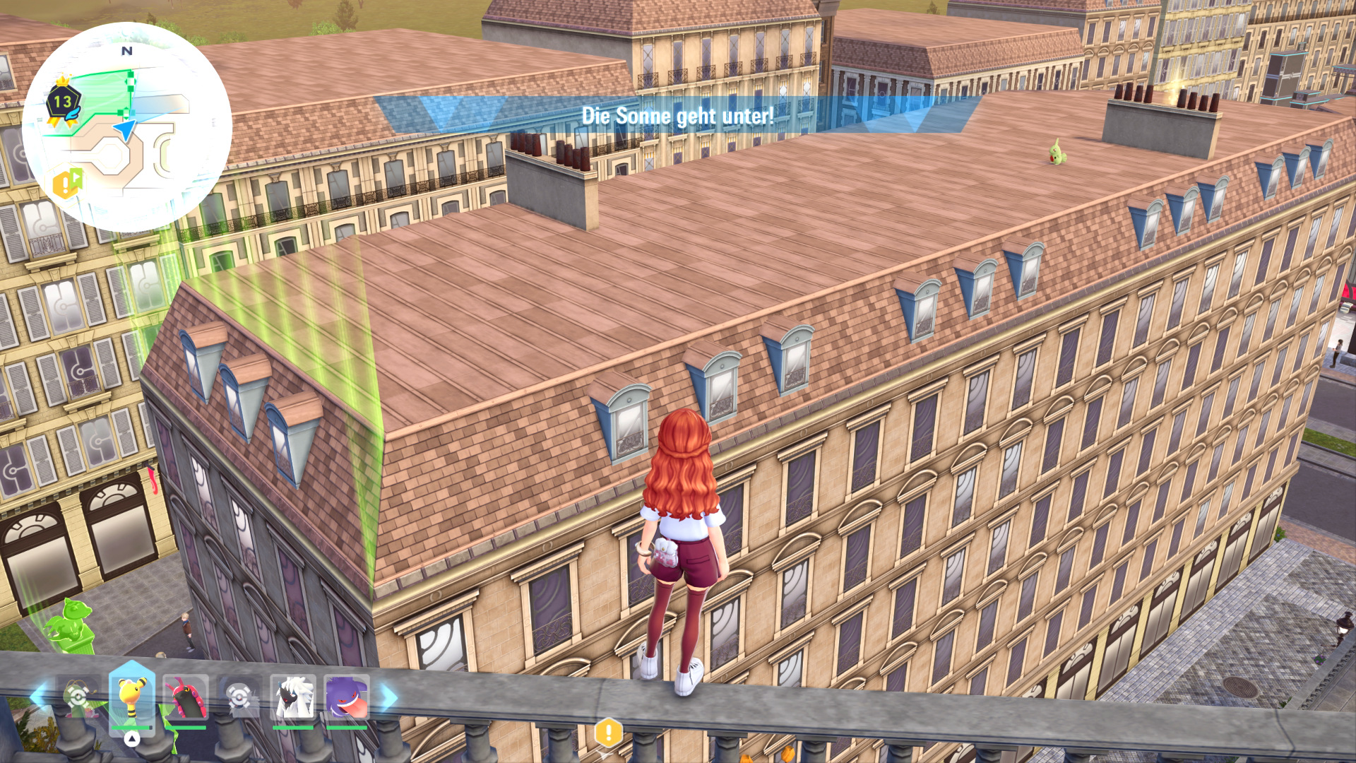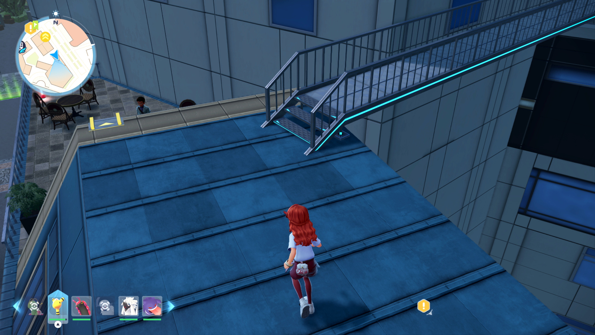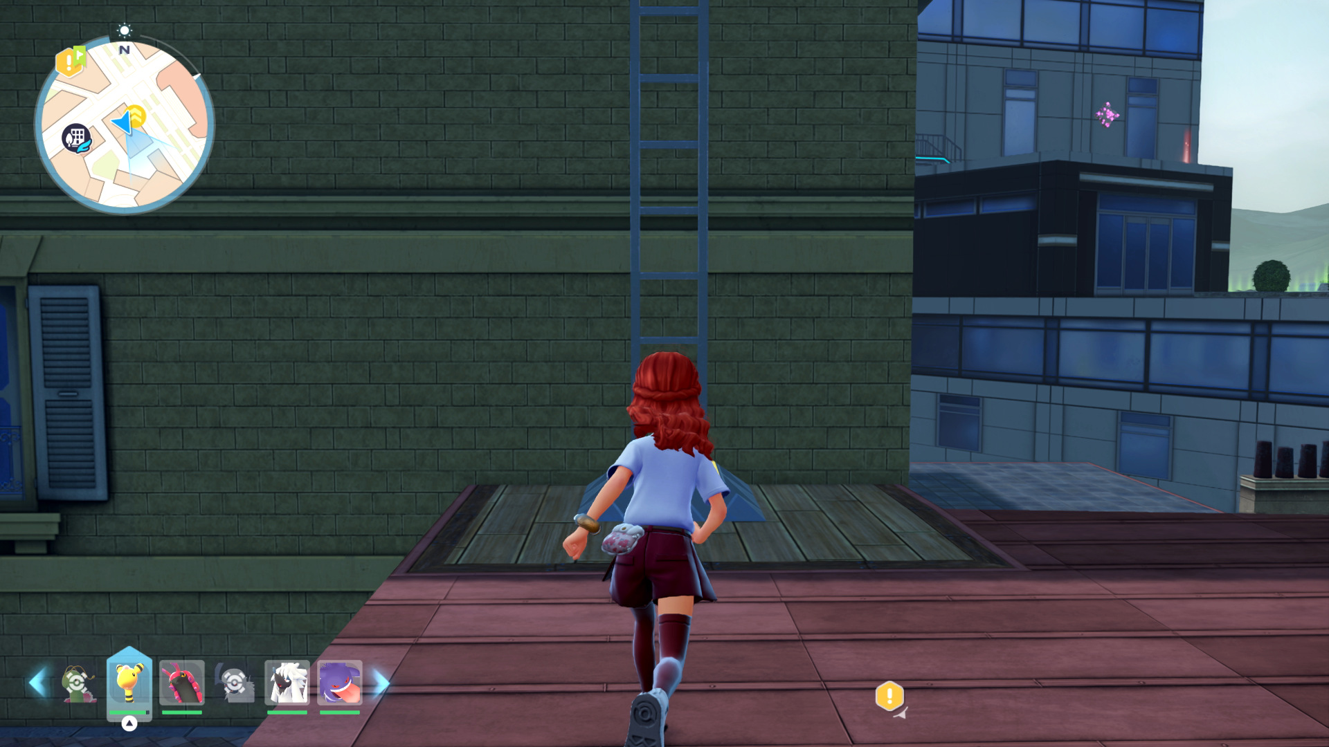 Fliegt zum Bistro Flordelis und lauft von dort nach links die Straße hoch. Nehmt den ersten Holo-Lift an der Hauswand rechts und klettert auf dem Dach die linke Leiter hinauf. Lauft von dort aus über ein Spinnennetz und eine Brücke bis zu einem etwas tiefergelegenen Dach, auf dem ihr Larvitar bereits von Weitem sehen könnt.