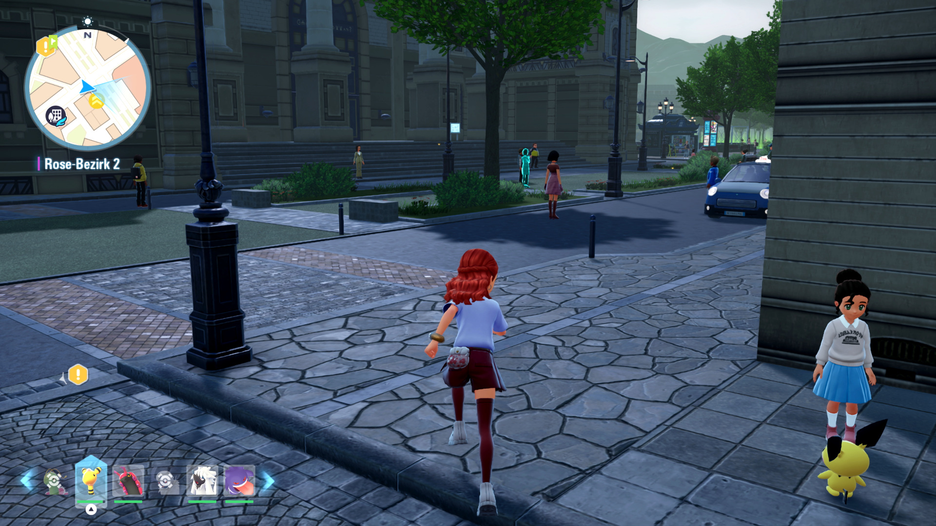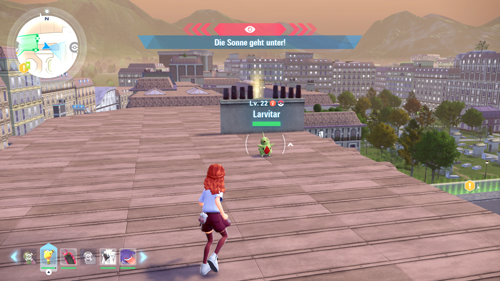 Fliegt zum Pokémon-Center (Cyan) und folgt dem Südring in Richtung Osten. Nehmt den Holo-Lift am Rand des zweiten Hauses und nehmt auf dem Dach direkt eine Leiter nach oben. Folgt dem Weg über das Dach und springt auf ein niedrig gelegeneres Dach, bevor ihr auf einem Dachteil mit Begrünung ein Larvitar findet.