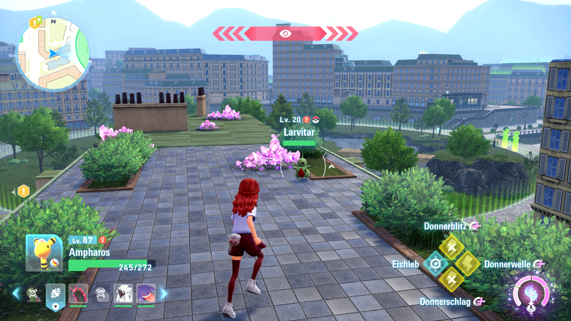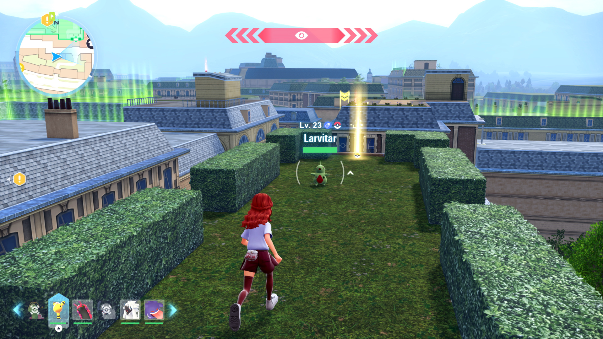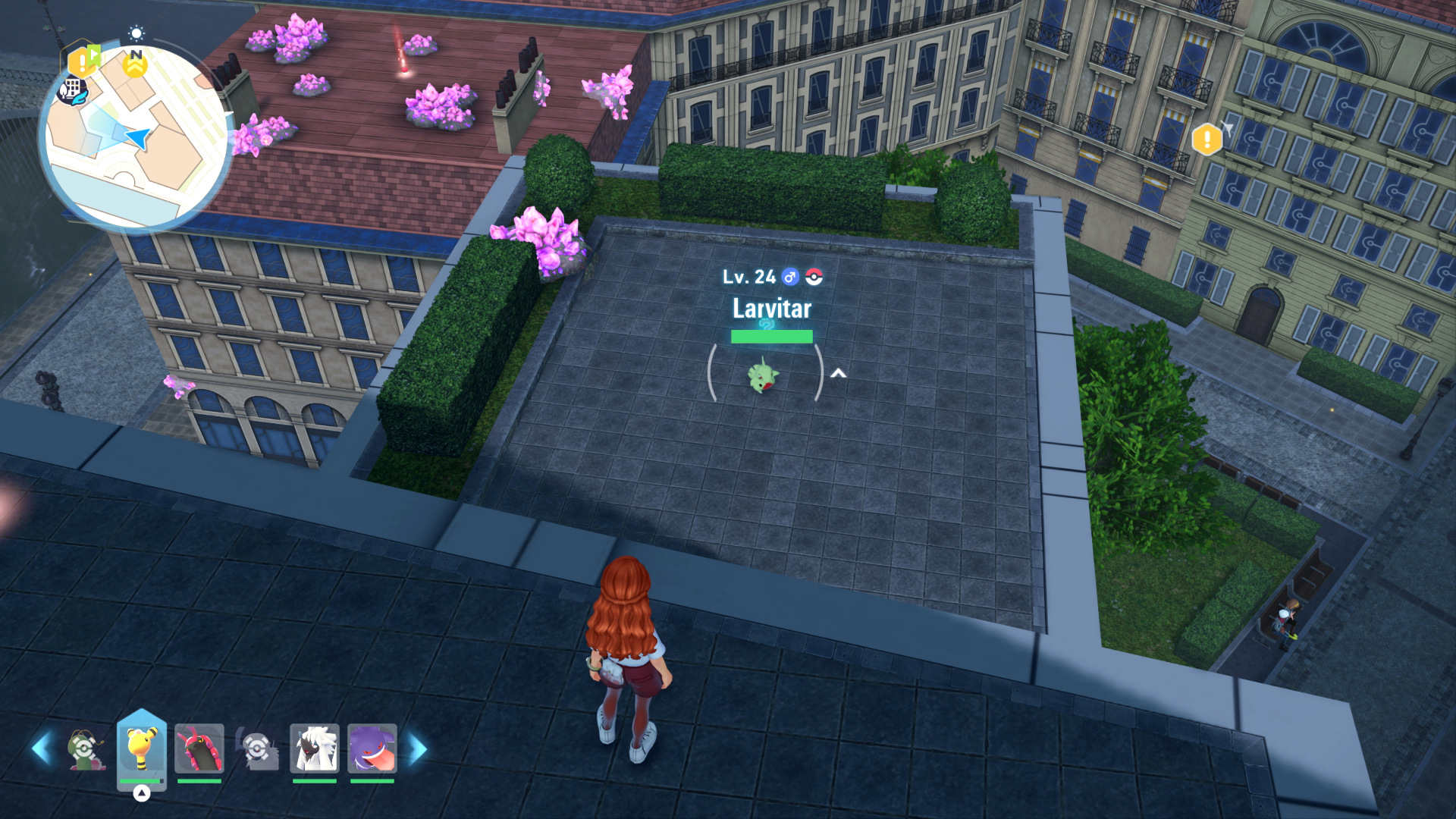Nehmt den Flugpunkt zu Imbiss Nouveau und lauft nach links in Richtung Wildsektor 2. Geht die Treppen rechts hinauf und nehmt die Leiter auf das Dach. Geht auf dem Dach nach links und folgt dem Weg. Springt vom einen auf das andere Dach und geht weiter den Weg entlang bis ihr auf Larvitar trefft.