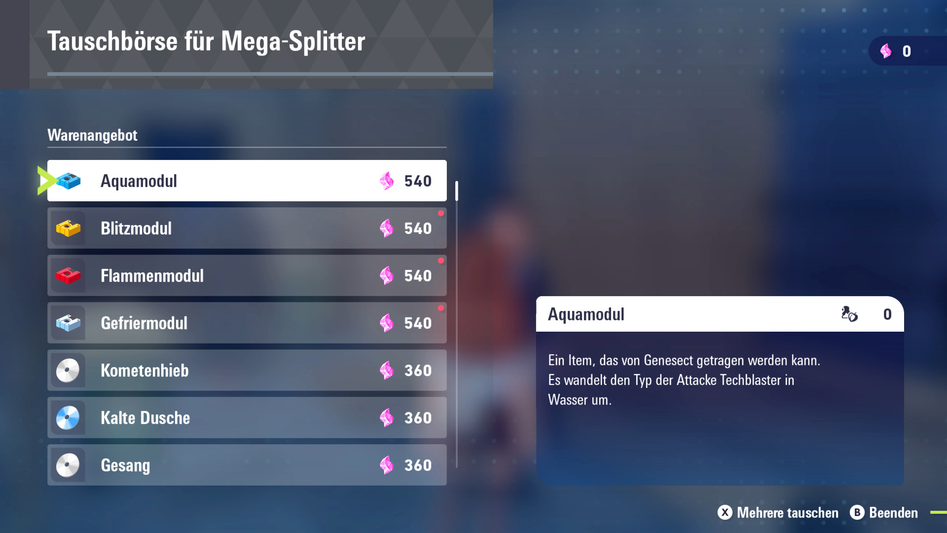 Geht zu dem Verkäufer für Mega-Splitter. Er befindet sich in der Nähe von Wildsektor 17 in einer kleinen Sackgasse im Verte-Bezirk 7. Nachdem ihr Rayquaza besiegt habt, verkauft er die Module von Genesect. Er gibt euch die Nebenmission 191 "Handel mit Modulen" bei der ihr zunächst alle vier Module für Genesect von ihm abkaufen müsst: Das Blitzmodul, das Flammenmodul, das Gefriermodul und das Aquamodul.