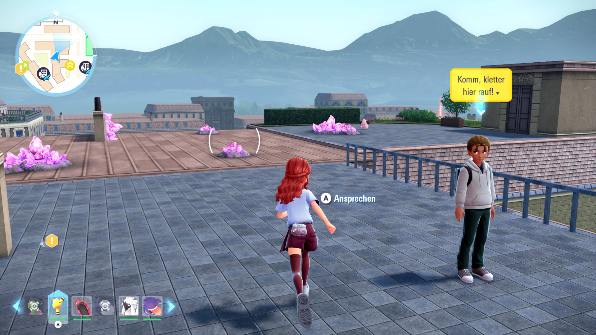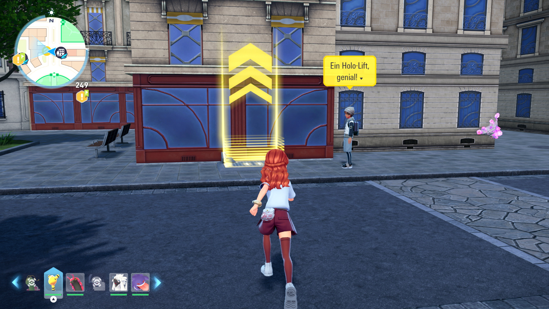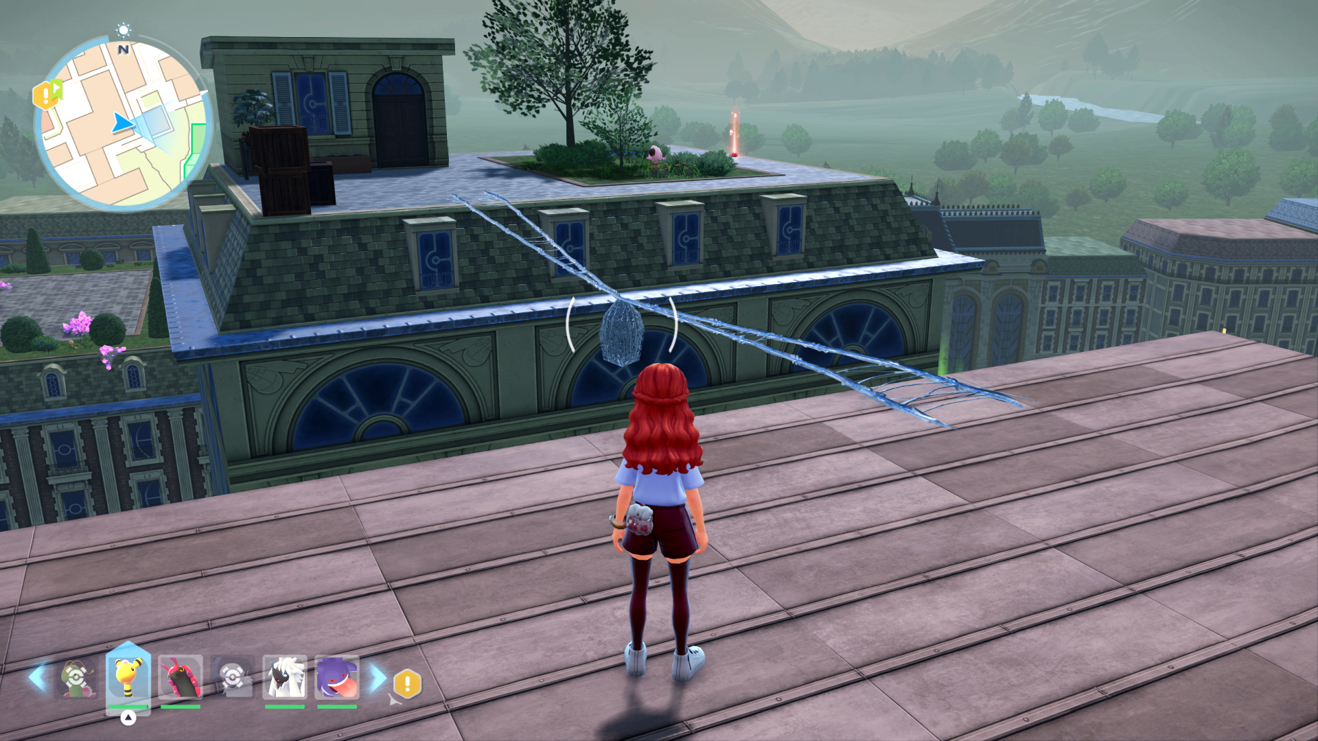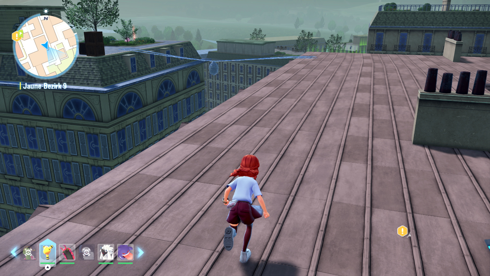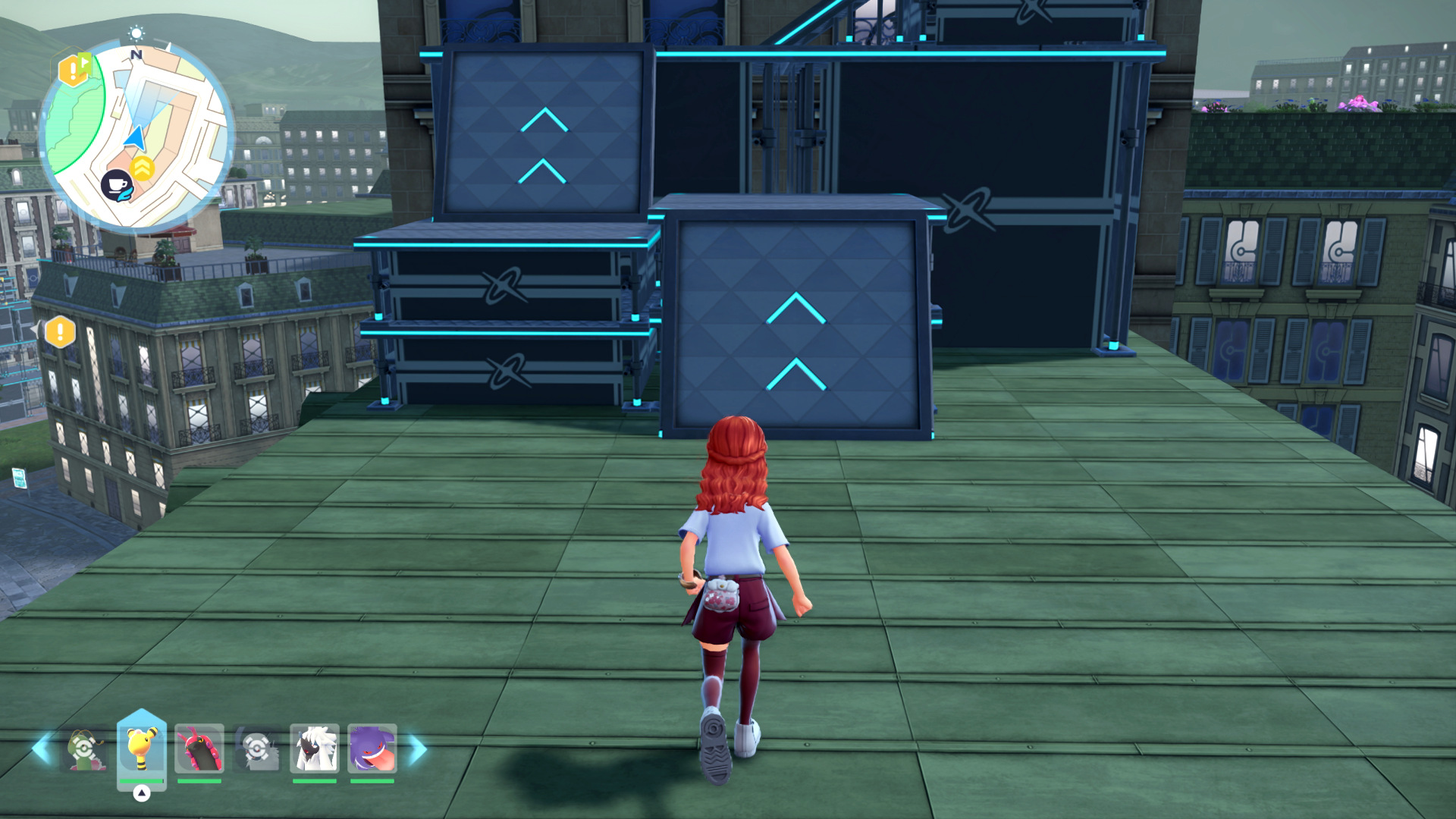 Fliegt zum Pokémon-Center (Jaune) und lauft die Treppen hinauf. Nehmt den Holo-Lift und springt von dem Dach quer auf ein anderes Dach, welches etwas tiefer gelegen ist. Folgt dem Weg über die Dächer bis ihr zu einem Kokon kommt, das ihr mit einer Attacke zu einem Spinnennetz aufspannend könnt. Greift den Kokon an und lauft auf die andere Seite, wo sich Pii befindet.