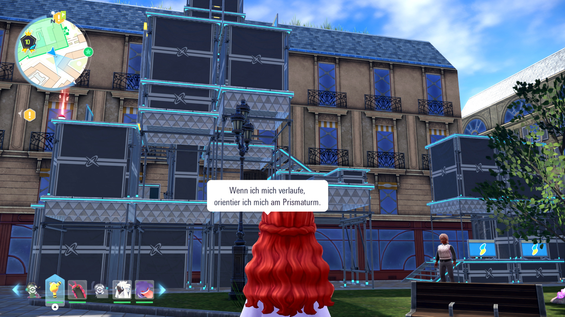 Fliegt zum Café Adonis und geht von dort aus nach links in den Innenhof des Hauses. Nehmt die Leiter und klettert auf das Dach. Geht über die Dachschrägen weiter nach oben und zerstört dort die Mega-Kristalle, die den Weg vor der Leiter versperren. Nehmt die Leiter auf das höchste Dach, um Pii zu finden.