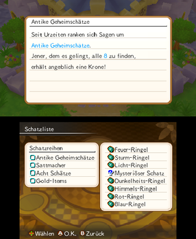 Bis auf die Gold-Items sind alle Schätze Ringel, die teilweise verbesserte Versionen normal im Spiel erhältlicher Ringel darstellen (Antike Geheimschätze) oder ähneln bzw. gleichen den Funktionen bestimmter Sipale (Acht Schätze). Die genauen Beschreibungen zu den Ringeln lassen sich auf unserer Seite zu Ringeln und Sipalen nachlesen.
