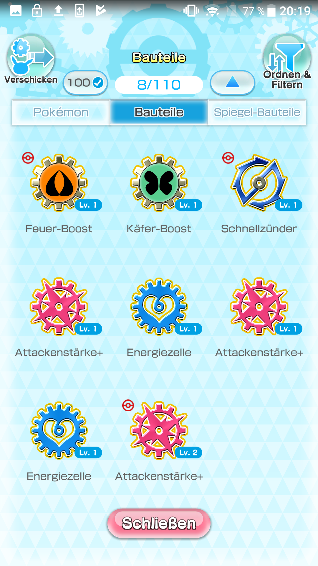 Es gibt zwei Arten von Bauteilen: die sogenannten Standard-Bauteile sowie die Spiegel-Bauteile. Die Bauteile können je nach Art sowie nach Level eine unterschiedliche Auswirkung haben und ihr könnt mit diesen Pokémon ausrüsten. Näheres dazu erfahrt ihr weiter unten.