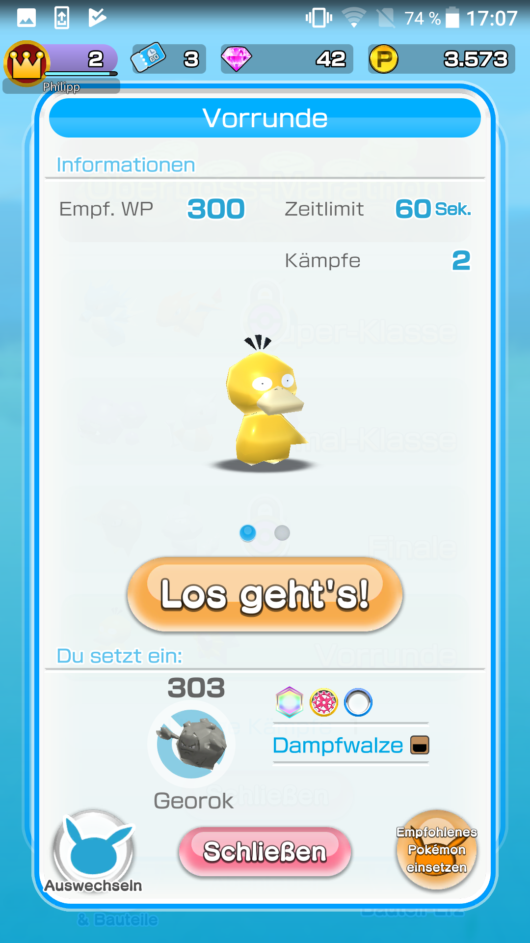 In Pokémon Rumble Rush könnt ihr einmal täglich beim aktuellen Turnier bzw. Marathon antreten. Dabei müsst ihr in verschiedenen Runden gegen zwei oder mehrere Oberbosse antreten und alle Bosse einer Runde innerhalb des vorgegebenen Zeitlimits besiegen. Die Oberbosse werden dabei Runde für Runde stärker. Hinsichtlich eurer einsetzbaren Pokémon gibt es keine Beschränkungen. Den Marathon findet ihr im Startbildschirm unter Turnier.